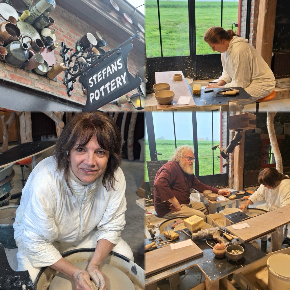 Om 12u30 stappen we terug in de auto en rijden we naar Roesbrugge.  We arriveren rond half 2 bij Stefan’s Pottery waar Stefan ons met een beetje tegenzin opwacht. We zijn een half uurtje te vroeg. Rond 2 uur arriveert de derde deelneemster en kunnen we beginnen. We krijgen een beschermpak, een soort overall, een bolletje klei en nemen plaats achter de draaitafel.  Voor mij is het een hernieuwde kennismaking met de draaischijf want ik heb het ooit al eens geprobeerd, maar dat is heel erg lang geleden. Het gevoel dat overheerst is dus een mix van opwinding en anticipatie om het deze keer toch een beetje beter te doen dan de vorige keer. Het pottenbakken is een eeuwenoud, mystiek ambacht, het transformeren van nederige aarde in iets duurzaams en ook al lijkt het eenvoudig dat is het zeker niet. Met pottenbakken gaat het erom de onvoorspelbaarheid te omarmen, te accepteren dat de klei soms een eigen wil heeft. We duiken er dus in met een open geest, klaar om lekker te kliederen. Ja, ik sta te popelen om mijn handen in die klomp klei te steken