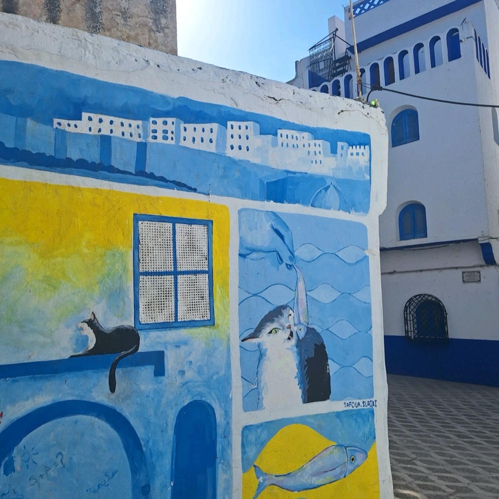 Het verhaal van de medina van Asilah is fascinerend. In de 15e eeuw veroverden de Portugezen dit kuststadje en bouwden ze de vestingmuren die er nu nog steeds staan. Wandelend door de oude straatjes horen we bijna de echo's van de geschiedenis – van Portugese soldaten tot Marokkaanse vissers die hier al eeuwenlang wonen. De medina zelf is opmerkelijk goed bewaard gebleven, en wat ons het meest opvalt, is hoe het aanvoelt als een echte, levende gemeenschap in plaats van een toeristische attractie. Van buitenaf geeft de medina niets prijs, verborgen achter een dikke muur en bekroond door een imposante Portugese donjon. Binnen de vestingmuren is het een heel ander verhaal: smalle steegjes met betoverende kleuren, katten die tussen bloempotten door slalommen, een paar ambachtswinkels, kunstgaleries en af en toe een voorbijganger op een fiets. Het pittoreske, blauwe dorpje is vooral beroemd om haar historische medina met Moorse, Spaanse en Portugese architectuur en het jaarlijkse culturele kunstfestival. Elk jaar verandert de medina in een openlucht kunstgalerie tijdens het Internationale Culturele Moussem van Asilah. De sporen daarvan blijven het hele jaar zichtbaar, waardoor Asilah een onverwachte street art-bestemming is. Het is voor mij zonder twijfel nu al een van de mooiste plekken in Noord-Marokko. Het stadje is zo fotogeniek en heel gemoedelijk. Het straalt een zekere rust uit. Totaal niet vergelijkbaar met andere medina’s. Hier is iedereen super vriendelijk, ze laten ons rustig kijken naar hun koopwaar. Echt een nog onontdekt pareltje en er zijn ook nauwelijks toeristen.