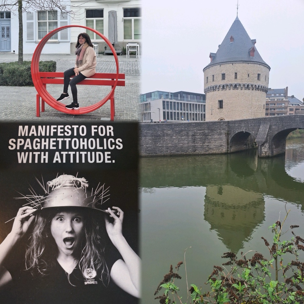 Vandaag trekken Ann en ik naar de westhoek om te gaan pottenbakken. Ja jullie horen het goed, we gaan artistiek aan de slag op het platteland.  De try out start pas om 2 uur dus besluiten we eerst naar Kortrijk te rijden om daar alvast te lunchen. Na twee uurtjes rijden, arriveren we rond 10 uur in de stad die gedomineerd wordt door de Leie. We parkeren in de K parking, het grote shoppingcenter van Kortrijk. Veel valt er niet te beleven dus wandelen we al snel door de stad in de richting van het water. Aan de Bruultorens is het nog lekker rustig want heel Kortrijk zit in de kerk. Toen we er passeerden stond er een rij van wel 100 m lang. De man of vrouw waar ze vandaag afscheid van nemen, moet wel iemand belangrijk zijn geweest voor de stad. We lunchen bij Mr. Spaghetti waar ze vandaag een wedstrijd houden: binnen de 30 minuten, 2 kg 300 spaghetti bolonaise naar binnen spelen. Lukt dat, dan krijg je de spaghetti gratis en staat je naam op de wall of fame voor de eeuwigheid. Lukt het niet, moet je alsnog 30 euro betalen bovenop de misselijkheid die je dan hoogstwaarschijnlijk voelt. Wij houden het bij een normale portie.