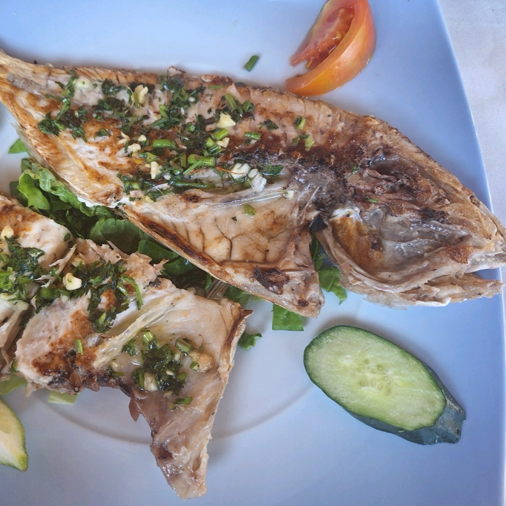Net buiten de poorten van de medina vind je een lange straat vol cafés en restaurants. We kregen een tip van een kunsthandelaar, waar Dee Dee een schilderijtje kocht om te gaan eten bij Yalla. Ook al zitten we aan zee, we hebben zin in tajine met pruimen maar al snel moeten we van gedacht veranderen. De tajine is uitverkocht! Dan gaan we maar voor vis, die moet hier toch goed zijn, denken we. Eerst wordt er een kleine appetizer en heerlijk brood op tafel gezet. Wanneer de vis komt, zijn we een klein beetje teleurgesteld want hij is zo hard gebakken dat er van de vis niet veel overblijft. Slecht is het niet, maar we hebben al beter gegeten. Wanneer er ook nog eens vijf katten bij onze tafel komen bivakkeren, houden we het voor bekeken. Gelukkig betalen we ook nu weer een habbekrats - 10 euro per persoon.