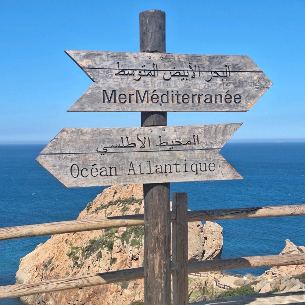 Voor we de stad definitief achter ons laten, rijden we nog eerst even naar Cap Spartel waar de Middellandse zee en de Atlantische oceaan elkaar ontmoeten. Dit is uiteraard een top locatie voor alle toeristen die Tanger bezoeken, zo ook voor de Chinezen. Ik hoef jullie niet te vertellen dat het even duurt alvorens we een foto kunnen nemen. Daarna zetten we koers naar Asilah. Eens we Tanger buiten rijden, voel ik het al: de rust die zachtjes over me heen daalt. De torenhoge appartementsblokken verdwijnen langzaam uit het zicht en al snel rijden we door groene vruchtbare velden met aan onze rechterkant het blauw van de oceaan. We hebben de kustweg bijna voor ons alleen. Onderweg af en toe wat kamelen, hier en daar een koe en een kudde schapen komen we ook tegen.