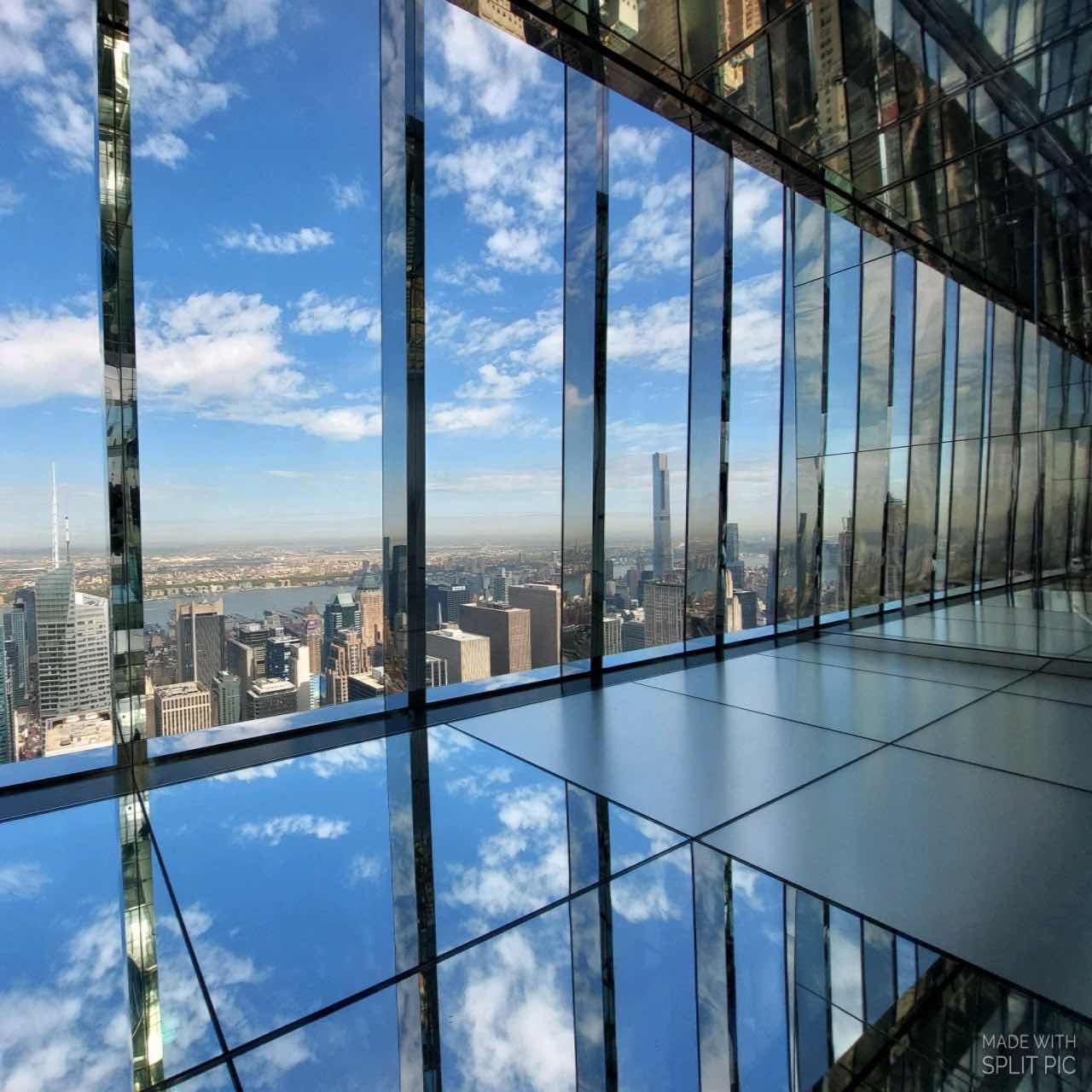 Om 9 uur hebben we de SUMMIT One Vanderbilt geboekt. Met twee verdiepingen vol spiegels van vloer tot plafond, biedt deze attractie een geheel nieuw perspectief op de stad terwijl de skyline van Manhattan overal om ons heen wordt weerkaatst. Bij aankomst moeten we eerst door de controle en dit keer word ik eruit gepikt en mag Dee Dee voor de verandering eens door. Daarna krijgen we een soort oversized papieren slippers die we over onze schoenen moeten trekken om het glas niet te beschadigen. Er wordt gevraagd of er niemand hoog sensitief is want de rit naar de 91st verdieping gaat gepaard met lawaai en lichtflitsen.