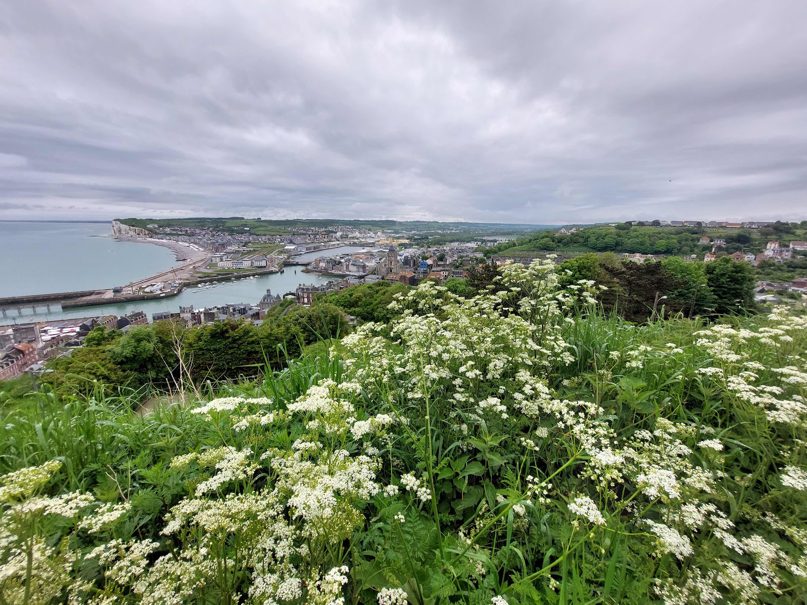 We passeren Le Treport en rijden tot helemaal boven waar er een uitzichtpunt is en van waar we met een telefrique naar de benedenstad kunnen. De regen is gestopt dus besluiten we hier even te stoppen. Aan één blik hebben we genoeg, we gaan stappen … beter naar beneden en dan zien we wel of we straks opnieuw te voet gaan of toch steil de berg opgaan met de telefrique.