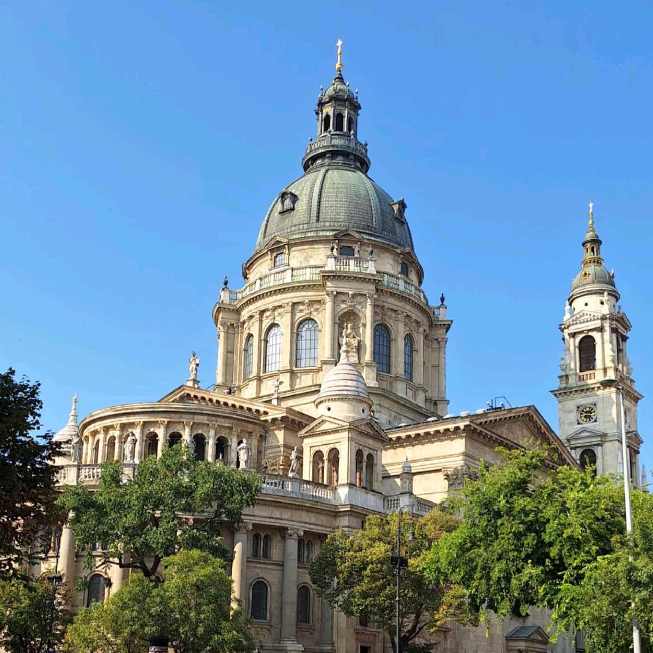 Waar je je ook bevindt in de stad, je hebt van overal uitzicht op de 100 meter hoge koepel. De linkse toren bevat 5 klokken, de andere slechts 1 maar dan wel een hele zware. Met een gewicht van 9 ton de zwaarste van het land. Je krijgt slechts 2 keer per jaar de kans om hem te horen luiden: op 20 augustus om 17 uur (dus dat valt al mee want dan zijn we nog hier) en oudejaarsavond om middernacht.