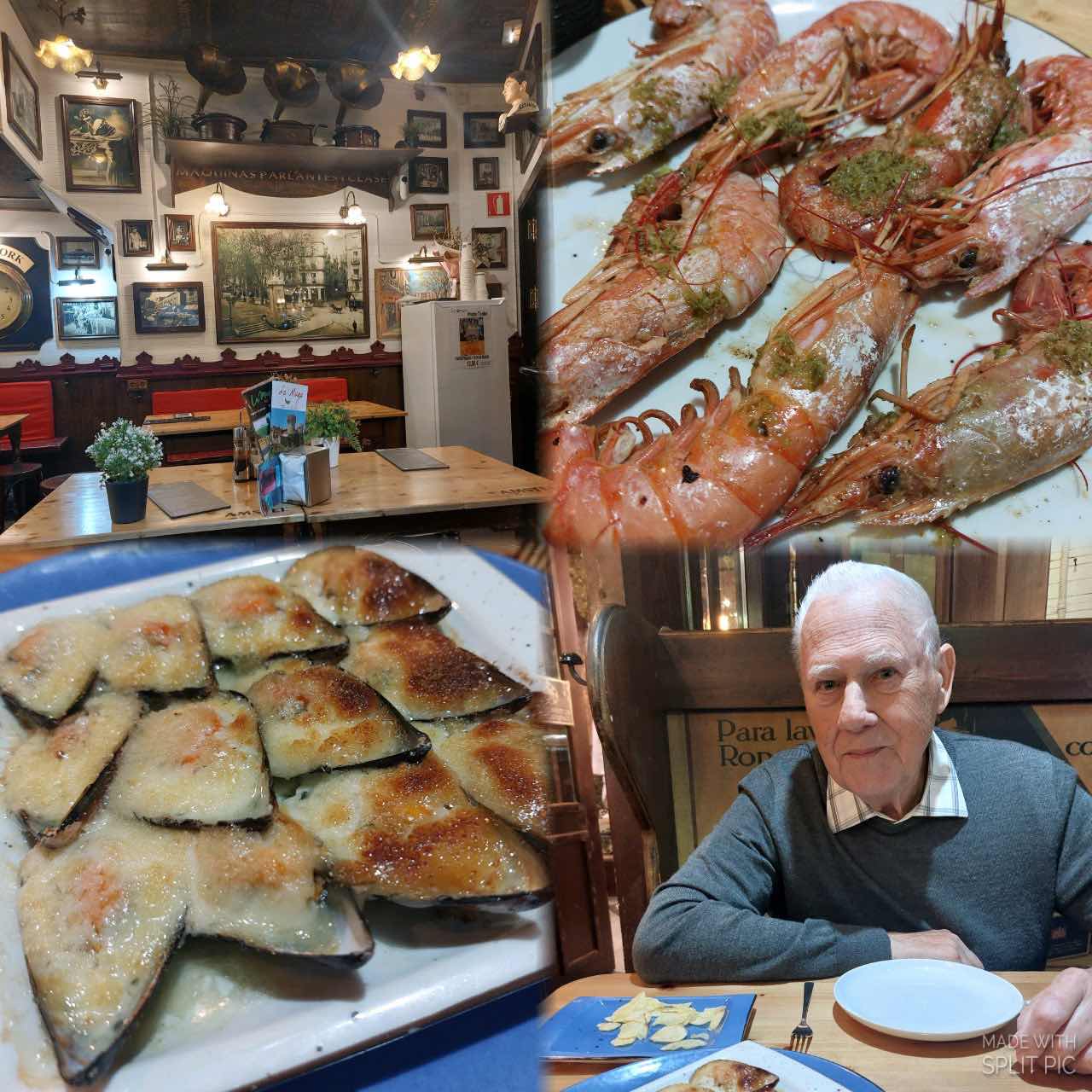 We hebben nog een hongertje dus trekken we de stad in om iets te gaan eten. We stranden bij La Muga, een gezellige tapabar. We zijn een beetje overdressed want de temperatuur is hier nog niet beneden de 25 graden gezakt. Morgen dus terug de zomer tenue bovenhalen. We nemen de mosselen met look en de gamba’s. Beide zijn heerlijk! Pa neemt nog een dessertje, crème Catalan maar het is meer toetjespap. Hij vindt het lekker dus wat maakt het uit dat het er niet uit ziet. Voor amper 35 euro hebben we gedronken en gegeten en voldaan wandelen we terug naar het hotel.