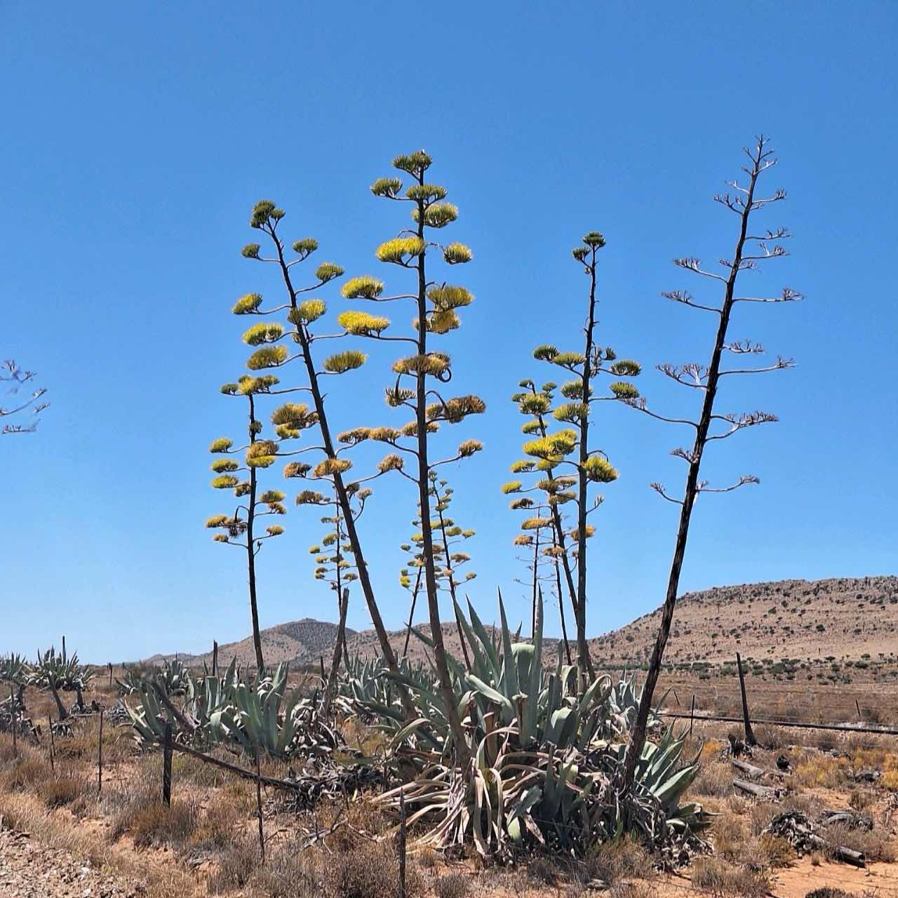 De eerste twee uren rijden we zo goed als alleen op de weg en het landschap is redelijk eentonig. Rondomrond omgeven door bergen en verder dorre vlaktes met hier en daar wat agaven langs de weg die het uitzicht toch een beetje kleur geven. Vreemd dat we hier geen wild zien, we hadden toch verwacht een springbok of twee tegen te komen.