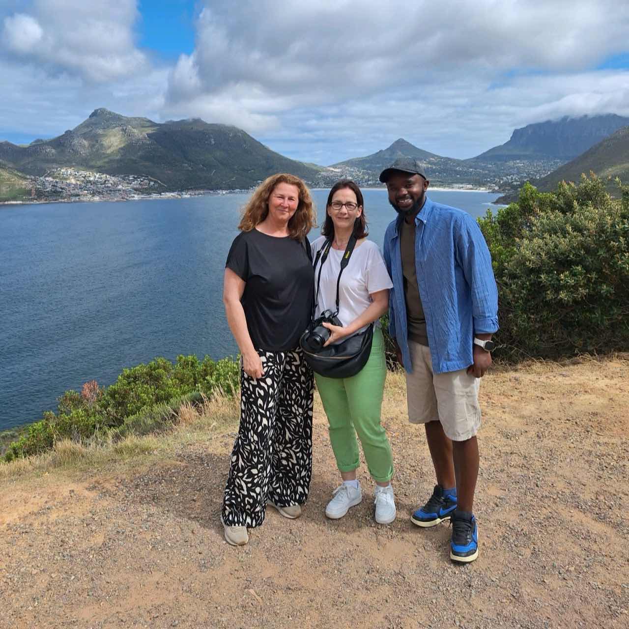 Na het ontbijt gaan we gepakt en gezakt klaarstaan aan de voordeur want we hebben vandaag een leuke dagexcursie naar Kaap de Goede Hoop geboekt. Onze persoonlijke gids Ferdinand pikt ons om 9 uur op. Het is een goedlachse Ruandees die al 7 jaar in Zuid-Afrika woont met vrouw en kind, die ons onmiddellijk op ons gemak stelt. Hij is mooi gekleed en heeft een grote spleet tussen zijn twee voortanden. Bij de eerste stop krijgen we elk een flesje water want ‘het wordt warm vandaag’, zo zegt hij. We hebben deze ochtend trui en jas in de rugzak gestopt want volgens Yoann gaat het regenen. Tja, het weer in Zuid-Afrika valt niet te voorspellen. Aan de kant van de weg hebben we een prachtig uitzicht over de baai van Camp Bay.