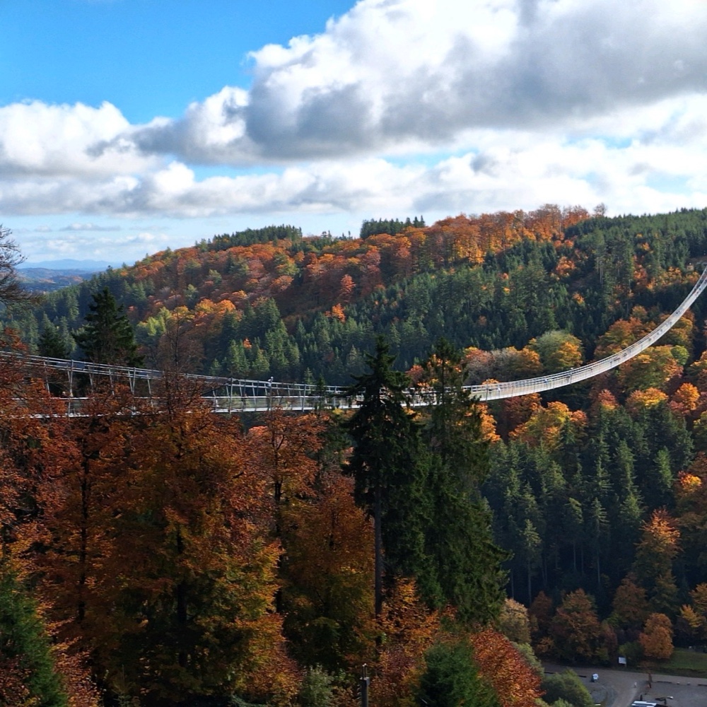 Ik had gedacht dat de brug wel wat last zou hebben van de wind maar dat valt eigenlijk ook wel mee. Pas als er windvlagen gemeten worden die enkele tientallen seconden de 80 km/h aantikken, gaat de brug dicht en dat is nu gelukkig niet het geval. De Skywalk beweegt echter wel. Als we er overheen lopen, voelt het alsof we op een boot staan. Ann heeft er geen last van maar ik ben na 10 minuten zo mottig als een krab! Eenmaal aan de overkant moet ik even bekomen met een theetje in de zon. Wanneer de mottigheid over is, keren we op onze stappen terug. Ann krijgt de slappe lach wanneer ik bijna lopend de brug terug over ga. Hoe sneller ik terug aan de overkant ben, hoe beter. Wanneer we terug de berg aflopen, begint er toch wel wat volk toe te komen. De kleine parking staat helemaal vol. Het is dan ook prachtig weer. Volgende stop is de Ettelsberg. Daar nemen we de Ettelsberg-kabelbaan die ons rechtstreeks naar de top van de berg brengt. Eenmaal boven hebben we een fantastisch uitzicht op het dal dat nu volledig in de zon ligt. De herfstkleuren zijn zo ongelooflijk mooi.