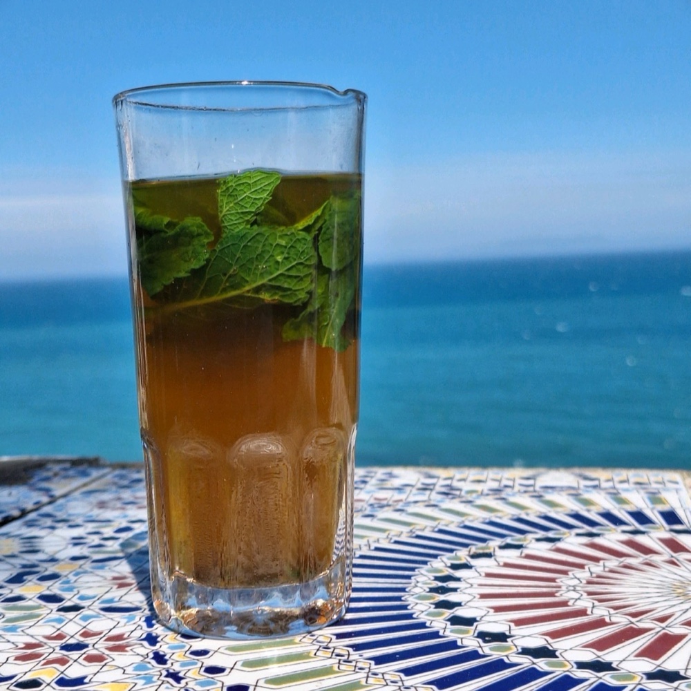 We wandelen in de richting van het water en kuieren over een promenade met zicht op de haven. Eigenlijk zijn we op zoek naar Café Hafa maar onderweg passeren we een Marokkaans kerkhof. Het is heel erg rustig in dit gedeelte van de stad. Grote verlaten pleinen met bankjes waar ik af en toe mijn voet kan stretchen, prachtige imposante gebouwen waar bewakers voor de deur staan. Google maps to the rescue, want Café Hafa ligt in een klein verlaten steegje. Hier drink je de beste thee van Noord-Marokko zo heb ik gelezen. Dit café bestaat al sinds 1921 en werd een belangrijke plek voor schrijvers en artiesten. Zij kwamen hier samen om onder het genot van een muntthee en een sigaret over het leven en de literatuur te praten. We zetten ons in de zon en genieten van het blauwe water in de verte. Het terras ligt namelijk op een klif met een prachtig uitzicht over de Middellandse Zee. De muntthee is lekker zoet en smaakt heerlijk.
