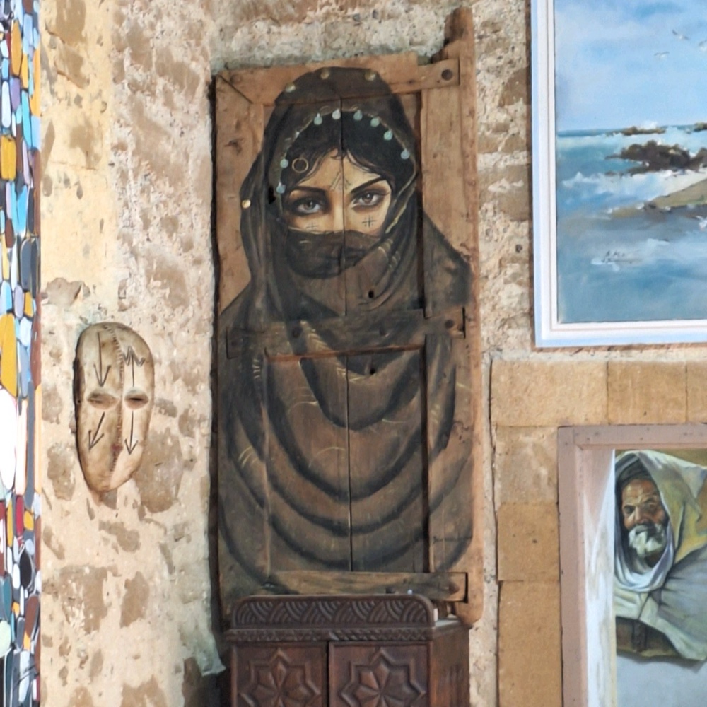 In Essaouira word je niet overvallen door overenthousiaste verkopers, maar kun je op je gemak rondkijken. Bij de meeste winkels is de prijs ook gewoon geafficheerd. In een mooie galerie word ik verliefd op een oude deur waarop een vrouw geschilderd is. Deze zou 2000 euro kosten, geleverd tot bij mij thuis maar de man wil gerust nog wat onderhandelen, zegt hij. Normaal mag je er er niet fotograferen maar terwijl Dee Dee de verkoopster afleidt, neem ik toch stiekem een foto. Alles beter dan niets.
