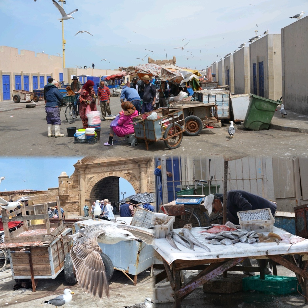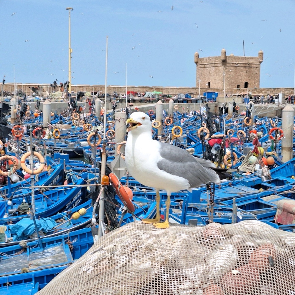Met een blij gevoel, wandelen we naar de vissershaven. Essaouira is een authentieke vissersplaats en aan het eind van de ochtend komen de houten blauwe bootjes binnenvaren met verse vis. De vis wordt direct op straat verkocht. Het is leuk om even doorheen te wandelen en te zien hoe de vissers hun netten uit elkaar halen. Alle vis die we hier zien, zwom vanochtend nog rond in de Atlantische Oceaan. Verser kan je het dus niet krijgen. Honderden meeuwen cirkelen krijsend boven de haven, waar ze proberen om de beste stukken vis mee te pikken.