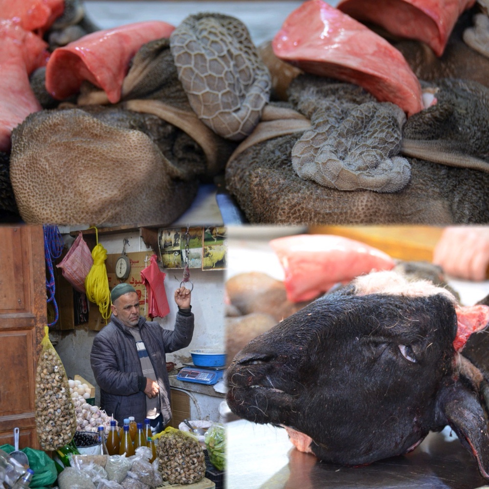 We nemen een kijkje op de plaatselijke markt die er toch heel anders uitziet dan bij ons. Vooral in de slagerssectie kijken we onze ogen uit. Kamelen- en koeienhoofden hangen hier gewoon aan de haak. Ook geiten kijken ons van een plateau aan. Heel fotogeniek allemaal! Sommige marktkramers maken er geen probleem van dat je ze fotografeert andere worden boos. De sfeer is hier toch wel wat grimmiger dan in het noorden van Marokko.