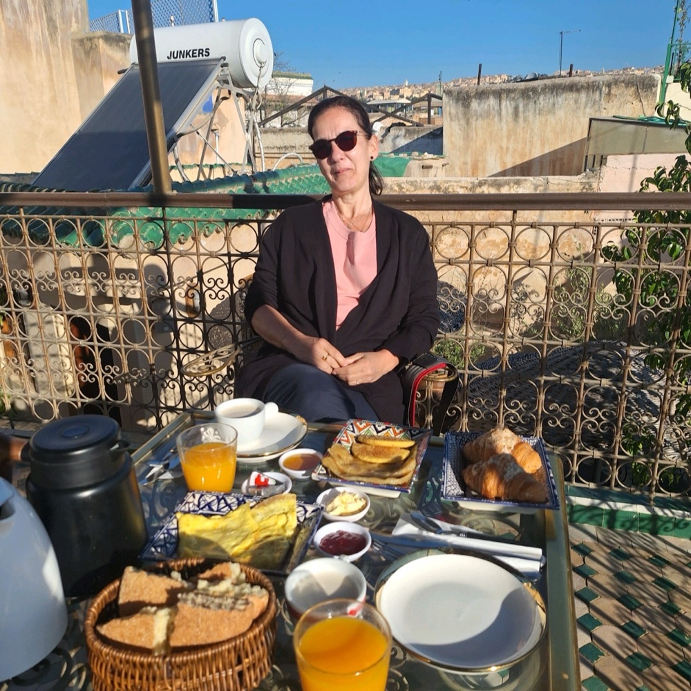 Na een dag dwalen in de medina is er niets fijner dan even uitrusten op het dakterras van onze riad. Gerard en Monique vervoegen ons en we praten nog even over alle indrukken die we vandaag hebben opgedaan. We kunnen niet zeggen dat we echt fan zijn van Fez. Authentiek is het zeker, maar voor ons straalt het niet echt veel charme uit. Misschien zijn we een beetje verwend door wat we al gezien hebben de voorbije week.