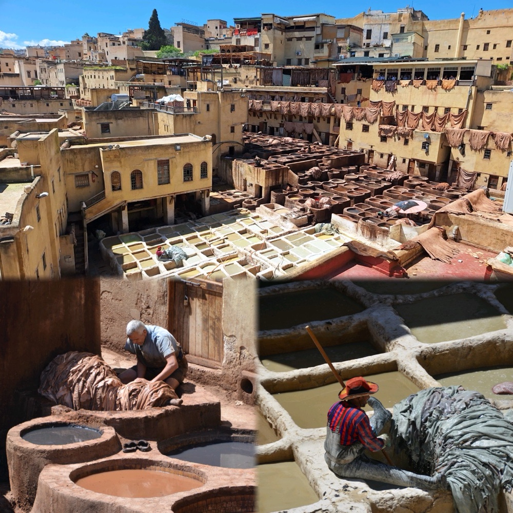 Wie aan Fes denkt, denkt aan leer. De stad staat bekend om haar eeuwenoude leerlooierijen, waar nog steeds gewerkt wordt zoals eeuwen geleden. De bekendste is de Chouara Tannery: een kleurrijk doolhof van ronde verfbaden. We zien mannen tot hun middel in de kuipen staan. Huiden van schapen, koeien, geiten en dromedarissen worden, na het verwijderen van haar en vlees, geweekt in vaten en vervolgens gedroogd. Daarna worden ze overgedragen aan de leerlooiers. Dat alles gebeurt gelukkig in de buitenlucht want het looien van leer gebeurt hier nog op traditionele wijze, met natuurlijke middelen zoals duivenpoep, kalk, plantenextracten en dierenvet.