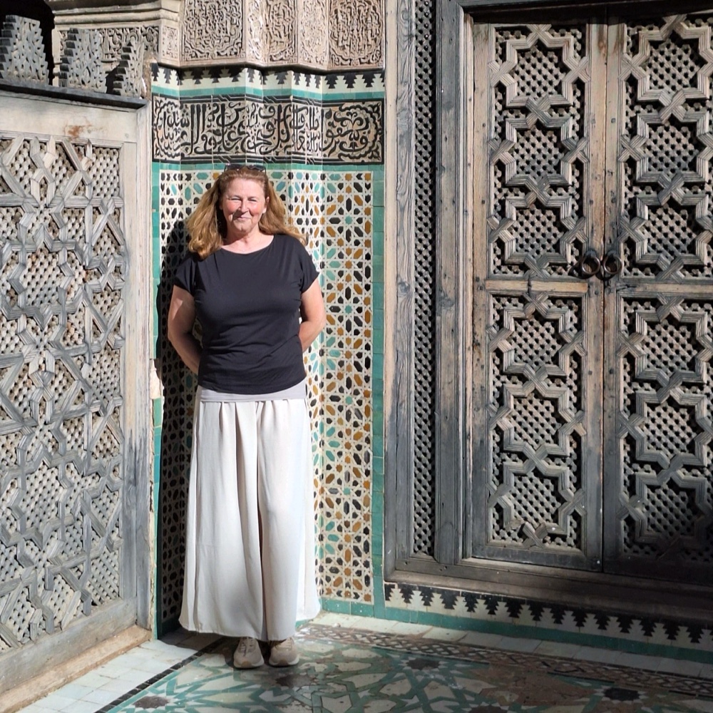 Fouet neemt afscheid van ons rond half 3 bij restaurant Nayar, waar we met z’n allen lunchen op het dakterras. Eerst wordt de tafel volgeladen met heerlijke Marokkaanse salades en daarna volgt een vers gemaakte bastilla. Het dessert bestaat uit heerlijk fruit met kaneel. Ik ben echt geen fruiteter maar hier is alles zo lekker en zoet. Van hierboven hebben we een prachtig zicht over de stad. Na de lunch trekken we door het leukste stuk van de medina. Mannen in djellaba’s drinken zoete muntthee op een terras. Traditioneel geklede vrouwen zoeken intussen sappige granaatappels uit bij een volgeladen kraam. De sfeer is hier levendig en een beetje chaotisch. Fes voelt echt alsof we een stap terugnemen in de tijd. We hebben het gevoel dat er in de steegjes van alles gebeurt waar we als reiziger geen weet van hebben. Ezeltjes sjouwen nog altijd goederen door de smalle straatjes, precies zoals ze dat eeuwen geleden ook al deden. Ze hebben altijd voorrang. We worden gewaarschuwd met de woorden ‘Balek, Balek’ (opgepast) of ‘Attention, Attention.’ Sommige steegjes zijn nog geen 2 meter breed. Zoek dan maar eens dekking als er een ezel passeert.